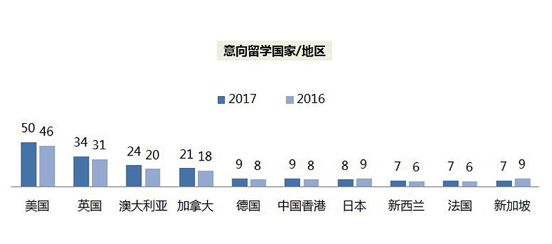 在留學(xué)國家的選擇上,美國連續(xù)三年仍是留學(xué)首選——50%的學(xué)生傾向選擇美國,英澳加緊隨其后,德國、中國香港、新西蘭和法國的占比較去年有小幅提升,留學(xué)目的國分布的整體格局較為穩(wěn)定。