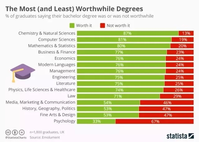 最近,國外一家薪資調(diào)查網(wǎng)站Emoulment公布了一個調(diào)查結(jié)果:由1800名應(yīng)屆畢業(yè)生評選出的,大學(xué)里最有用和最不值得讀的專業(yè)。