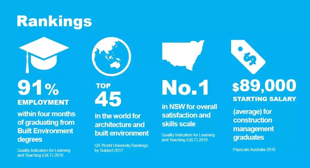 根據(jù)最近幾年的數(shù)據(jù)統(tǒng)計,澳洲紐卡斯?fàn)柎髮W(xué)該學(xué)科的世界排名為世界45名,新南威爾士州第二, 新南威爾士州學(xué)生滿意度排名第一,畢業(yè)生的就業(yè)率在91%以上,最誘人的是工程管理專業(yè)畢業(yè)生的平均起薪在89000澳幣。畢業(yè)生可以從事 建筑設(shè)計師(Architect)、施工經(jīng)理(construction manager)和 工料測量師(quantity surveyor)的工作,目前為長期緊缺移民職業(yè)。
