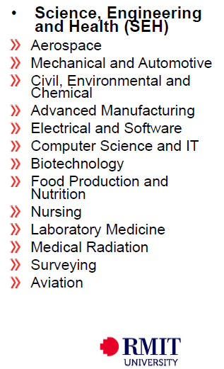 該獎(jiǎng)學(xué)金面向攻讀RMIT皇家墨爾本理工大學(xué)科學(xué)、工程與健康學(xué)院的中國學(xué)生,該獎(jiǎng)學(xué)金可用于減免學(xué)費(fèi)。該學(xué)院主要為學(xué)生提供以下各專業(yè)的課程: