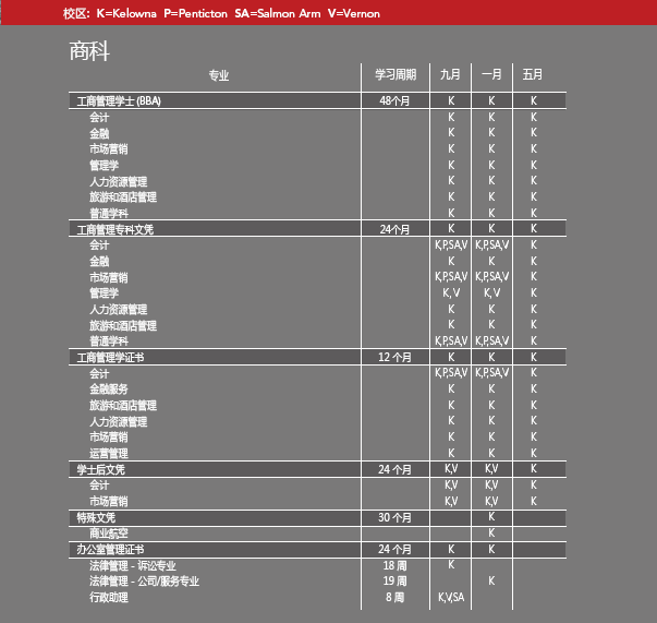 兩年文憑專業(yè):工商管理、計(jì)算機(jī)信息系統(tǒng)、當(dāng)代音樂技術(shù)、林業(yè)技術(shù)、高爾夫球場(chǎng)管理、環(huán)境規(guī)劃、多媒體制作與設(shè)計(jì)、護(hù)理、辦公室管理、漁業(yè)及野生動(dòng)物、度假村酒店管理等。