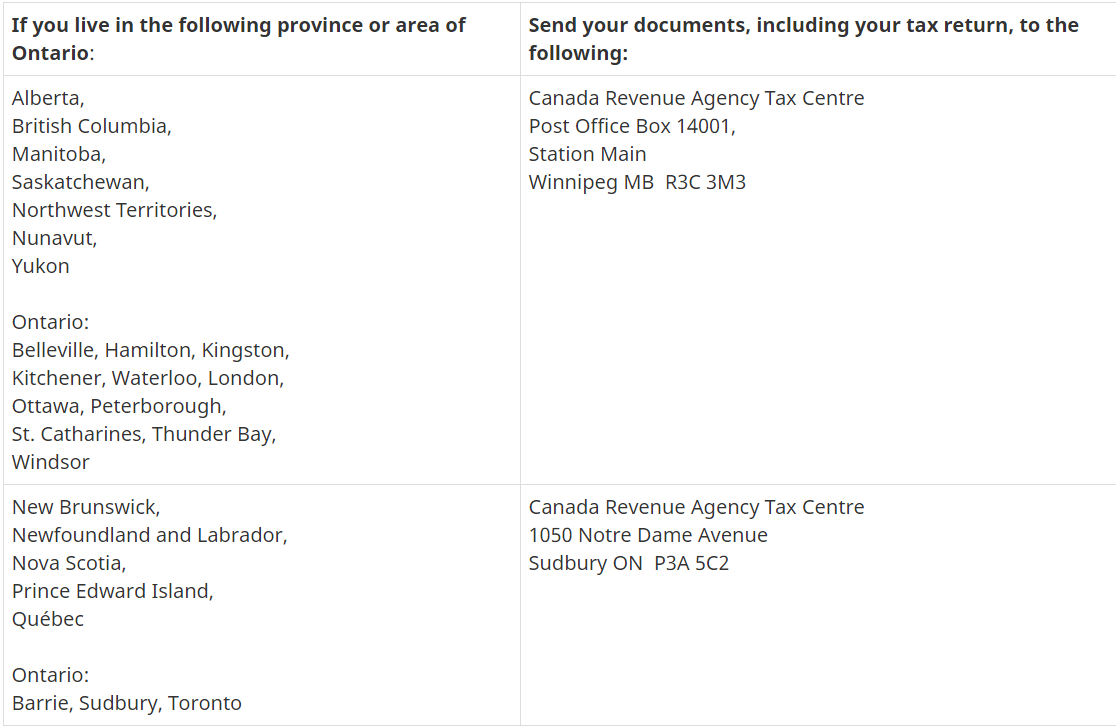 如果您要郵寄納稅申報(bào)單,請(qǐng)將其發(fā)送到加拿大稅務(wù)局(CRA)指定地址: