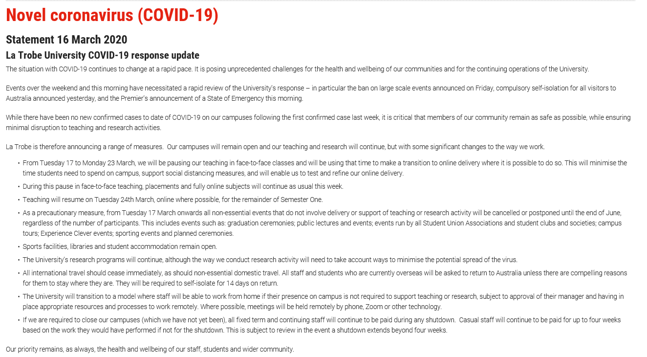 3月17日至23日將暫停面授課程,并將利用這段時(shí)間過渡到在線授課。教學(xué)將于3月24日以上網(wǎng)課形式恢復(fù)。從3月17日起,所有非必要活動(dòng)將被取消或推遲到6月底,無論參與者的人數(shù)。體育設(shè)施、圖書館和學(xué)生宿舍保持開放,大學(xué)研究項(xiàng)目將繼續(xù)進(jìn)行。詳情請(qǐng)查看官網(wǎng):https://www.latrobe.edu.au/about/novel-coronavirus