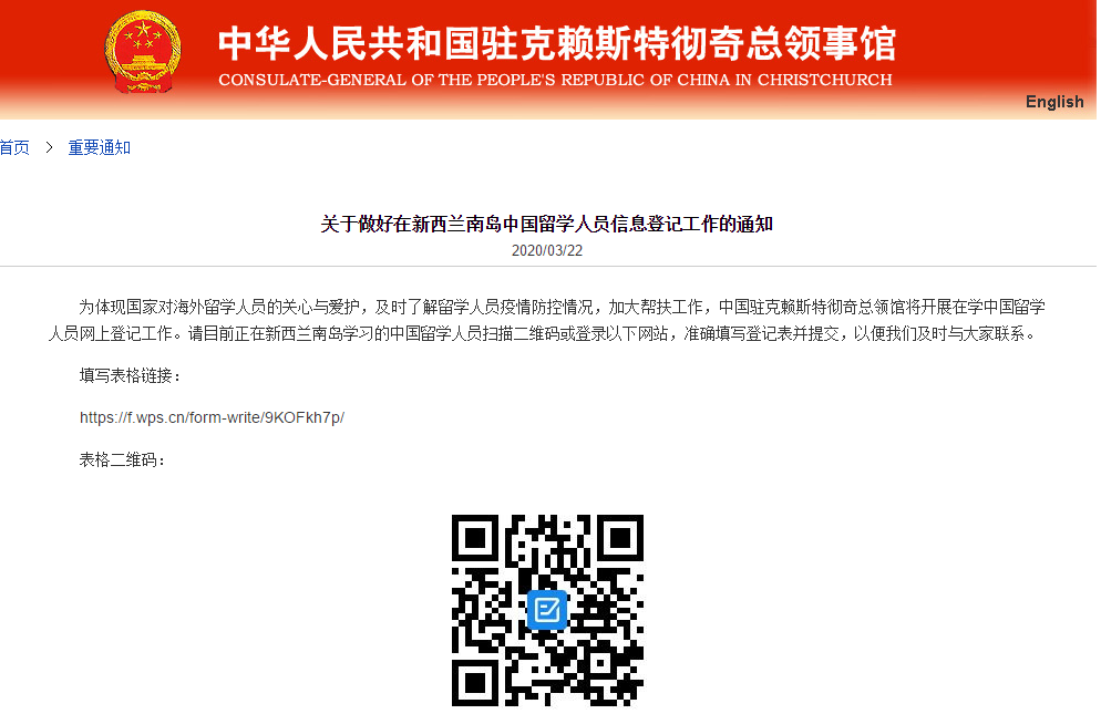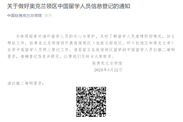 針對新西蘭疫情的發(fā)展,中國駐奧克蘭總領(lǐng)館及駐克萊斯特徹奇總領(lǐng)館發(fā)布了重要通知,要求在新西蘭的留學(xué)人員盡快做好信息登記工作,請在新西蘭的留學(xué)生花費幾分鐘時間,完成登記,以備不時之需。