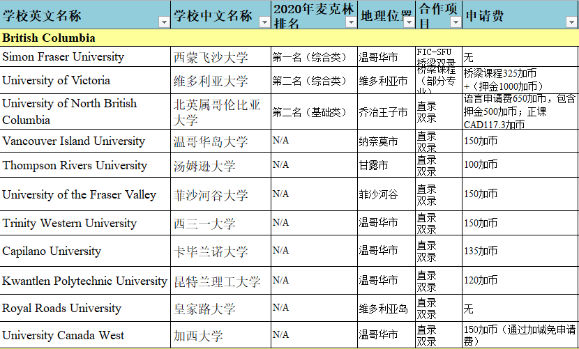 BC省可申請(qǐng)學(xué)校列表:
