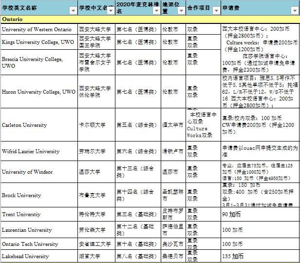 安省可申請(qǐng)學(xué)校列表: