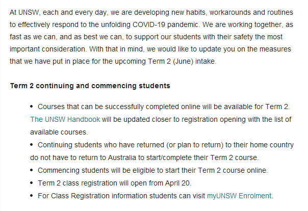 根據(jù)目前疫情情況, 新南威爾士大學(xué)Term2開學(xué)的課程,可以選擇線上學(xué)習(xí), 注冊開放時間為4月20日。