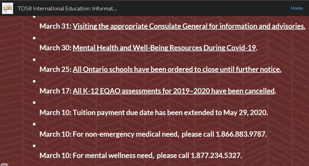 來看加拿大最大的公立教育局多倫多教育局Toronto District School Board在官網(wǎng)于疫情的友情提醒: