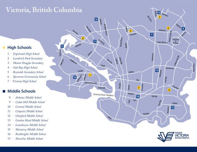 橡樹灣中學(xué)位于橡樹灣村附近,通過幾條主要公交線路與各學(xué)院、維多利亞大學(xué)和維多利亞市中心相連。學(xué)校開設(shè)有優(yōu)異生高級課程、高級法語課程、以及英語、視覺藝術(shù)、微積分和語法等科目的進(jìn)階先修課程。特色課程包括商務(wù)教育,應(yīng)用工程技術(shù)和藝術(shù)生產(chǎn)。