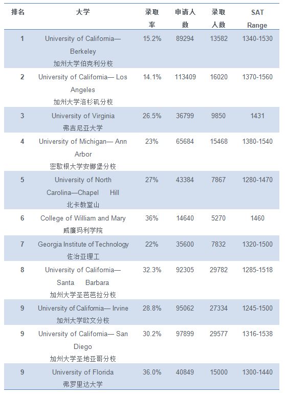 這10所公立大學(xué)分別為:加州大學(xué)伯克利分校、弗吉尼亞大學(xué)、密西根大學(xué)安娜堡分校、加州大學(xué)洛杉磯分校、加州大學(xué)戴維斯分校、加州大學(xué)圣地亞哥分校、加州大學(xué)爾灣分校(歐文)、加州大學(xué)圣巴巴拉分校、佐治亞理工學(xué)院、威廉瑪麗學(xué)院。