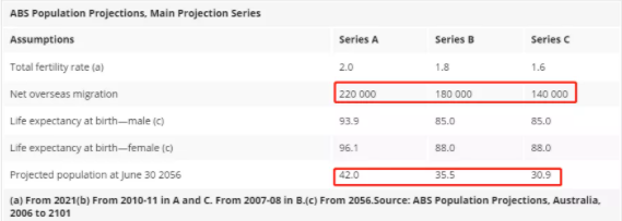 而根據(jù)澳大利亞統(tǒng)計(jì)局(ABS)的預(yù)計(jì),ABS將人口預(yù)測分為了A、B、C三種路線,其中B路線在很大程度上反應(yīng)了當(dāng)前的人口趨勢