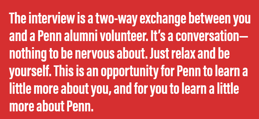 賓夕法尼亞大學(xué)(UPenn)解釋說:“面試是您和賓夕法尼亞州校友之間的雙向交流。這是一次對話——不用擔(dān)心,放松,做自己。這為Penn提供了一個(gè)更多了解您的機(jī)會(huì),也為您提供了有關(guān)Penn的更多知識的機(jī)會(huì)。面試是一個(gè)機(jī)會(huì),您可以作為候選人更好地了解您,也可以讓您更好地了解學(xué)校。”