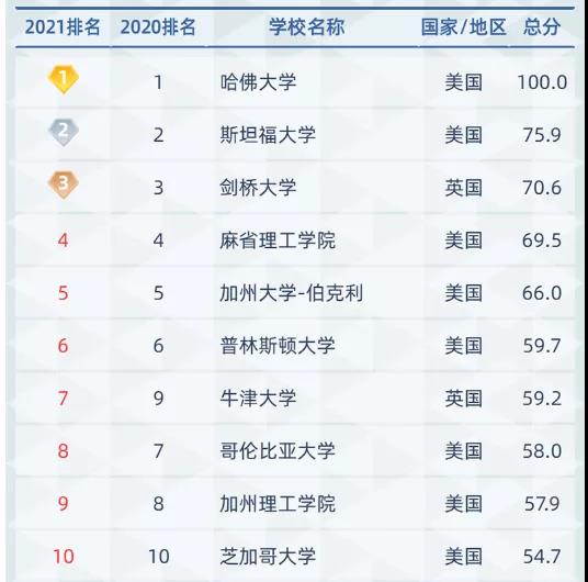哈佛蟬聯(lián)全球第一!在今年的排名中,Top10依然被英美國家霸榜。哈佛大學(xué)仍然穩(wěn)坐頭把交椅,連續(xù)19年蟬聯(lián)全球第一;斯坦福大學(xué)僅次于哈佛大學(xué),繼續(xù)保持全球第二名;劍橋大學(xué)保持全球第三。