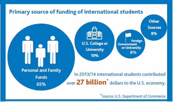 國(guó)際學(xué)生過去一年為美國(guó)的經(jīng)濟(jì)貢獻(xiàn)了270億美元, 65%的學(xué)生是自費(fèi)留學(xué)